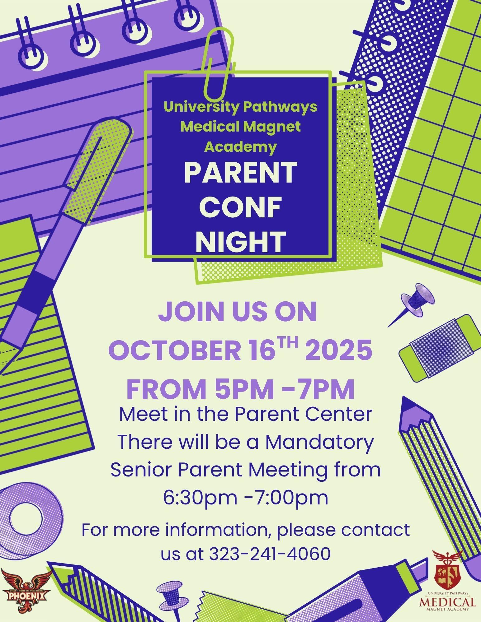 Parent Conference Night will be held, next Thursday, October 16th , 2025, from 5pm -7pm with a mandatory senior meeting from 6:30pm -7:00pm.